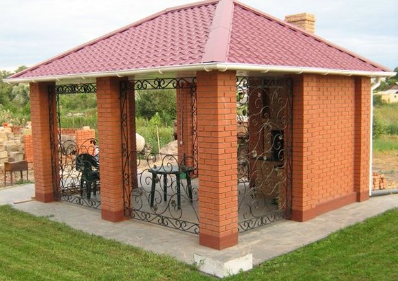 Беседки, построенные из кирпича, представляют собой надежные и серьезные сооружения. Но, как все помещения, имеют свои плюсы и минусы. К плюсам можно отнести: