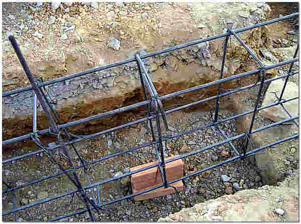 Главное, что необходимо запомнить, это то, что стержни не должны касаться дна фундамента. Стоит подложить кирпич или втыкнуть концы сетки в землю.