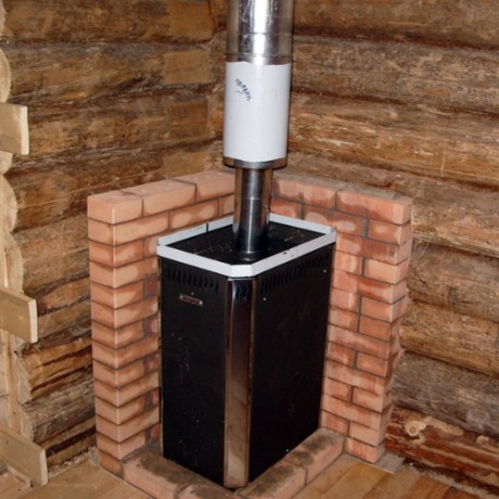 2.Экран из кирпича используется реже, чем металлический, но он является не менее действенным. Как правило, такой экран больше напоминает внешнюю обшивку, так как сама печь оказывается внутри этого кожуха. Также кирпичный экран может играть еще одной дополнительной стены, которая прокладывается между печкой и стеной из другого материала. Для того чтобы выполнить кладку экрана, необходимо использовать специальный кирпич, который называется полнотелым шамотным и кладется при помощи цемента и глиняного раствора. Специалисты говорят о том, что кладку лучше всего выполнять толщиной в 120 мм, а для этого можно использовать полкирпича. В самом низу, такого защитного щита, требуется оставить отверстия, чтобы можно было пропускать воздух возле стены и печи. Кирпичный экран, должен находиться на 20 сантиметров выше уровня самой печи, многие владельцы бань выполняют кладку до самого потолка. Экран из кирпича позволит сэкономить место, так как он кладется к самой стене печи.