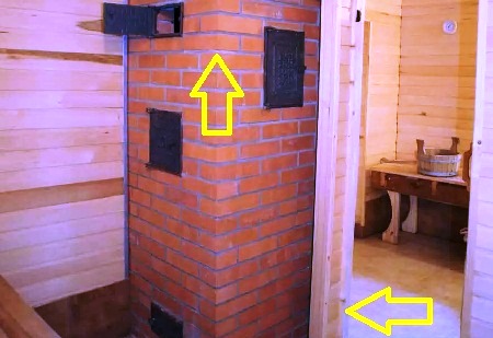 Дополнительная же система вентилирования должна происходить сквозь отверстие, размещать которое необходимо на высоте 50 см от уровня покрытия пола. Сам же выход воздушных масс будет проходить через трубу или печной дымоход, а также форточку, которую обязательно следует сделать в оконном проеме комнаты предбанника.
