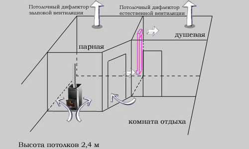 Чаще всего, в баньке применяется система притока и вытягивания воздуха. Чтобы сделать правильно, формируют приточные отверстия входа, так называемые отдушины, с помощью которых чистый воздух начнет уходить из помещения. Если это требует площадь парной и ее строение, то дополнительно для этого ставятся еще и вентиляторы, чтобы усилить данный процесс.