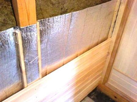 - на утеплитель накладываются гидроизоляционные материалы, чаше всего ими выступают, фольга, но также подойдет полиэтиленовая пленка, обязательно они накладываются внахлест, чтобы не было пустых мест, а закрепляются для надежности деревянными тонкими рейками.