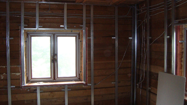 Прежде всего, для обшивки стен из бревен, необходимо соорудить каркас. Решетчатую основу возможно изготовить только лишь из деревянных реек. Можно также устроить специальную двойную обрешетку, которая делается сперва из бруска, а после из оцинкованных направляющих. Следует отметить, что изготавливаются они именно для крепления гипсокартонных листов. В первом случае необходимо будет укладывать листы двумя слоями. При втором варианте допускается обшивка в один слой. Делается это по двойной обрешетке. Тем не менее, если делать это в два слоя, то получится в разы надежней и прочней. Перед отделкой необходимо аккуратно удалить с бревен все засмолы. Их можно соскоблить или очень аккуратно вырубить. После этого следует также очень тщательно обработать сруб антисептиком. Необходимо также завершить все работы по проведению электричества в сооружение перед тем, как начинать отделку гипсокартоном. Если проводка должна быть скрыта под фальш-стену, то устройства необходимо закрепить таким образом, чтобы они выступали над основой миллиметров на 20.