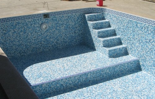 Чаще всего в процессе облицовке используется стеклянная мозаика. Именно она обеспечивает оригинальный внешний вид бассейна. Принцип укладки не отличается от того, который описан выше. В то же время, адгезия клея должна быть выше 2,5 МПа. До начала работы следует натянуть маяки, поскольку монтаж требует высокой точности. Если укладка мозаики предусматривает создание художественных элементов, то работы должна начинаться с центра чаши. То же самое можно сказать об укладке плитки. Причина такой необходимости вызвана тем, что всегда остаются обрезки, которые лучше всего спрятать по краям площади. Каждый элемент укладывается традиционным способом. В настоящее время производители предлагают новые решения, способные облегчить укладку мелких деталей. Так, рисунок мозаики формируется на специальном листе бумаги. После того, как лист заполняется, бумага смачивается и удаляется, а готовый узор укладывают на поверхность.