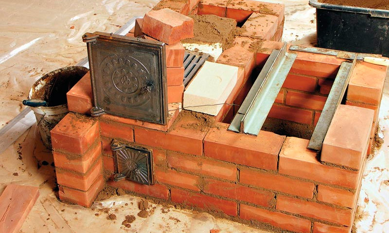 После прокладывания четырех рядов необходимо установить колосниковые решетки. После прокладки пятого ряда специалисты рекомендуют устанавливать окошки для того, чтобы прочищать пространство внутри печи после сгорания дров. На завершающем этапе строительства в эти проемы небольшого размера будут установлены дверца, которые придадут всей конструкции красивый вид. На этом же этапе желательно приступит к монтажным работам отопительного котла, который нужно надежно закрепить в кладке.